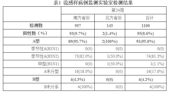 2012年第24周,全国流感监测网络实验室共检测1100份标本,其中流感病毒阳性标本95份(8.6%),以A型流感病毒为主。第24周,南方省份流感检测阳性率为9.7%,与前一周(11.3%)相比略有下降;北方省份流感检测阳性率为1.4%,与前一周(1.7%)相比有所下降。南、北方省份检测到的流感各型别/亚型的数量和所占比例具体见表1。