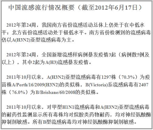 2012年第24周,国家流感中心对22株A(H3N2)亚型流感毒株和14株B型流感毒株耐药性监测显示,所有毒株均对神经氨酸酶抑制剂敏感。