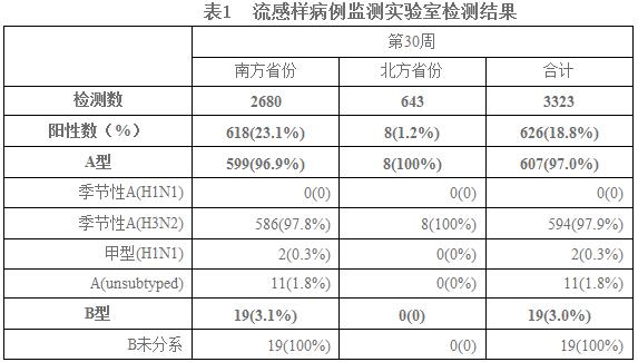2014年第30周,全国流感监测网络实验室共检测流感样病例监测标本3323份,流感病毒阳性标本626份(18.8%),其中A型流感607份(97.0%)、B型流感19份(3.0%)。第30周,南方省份流感检测阳性率为23.1%,高于前一周(21.9%);北方省份流感检测阳性率为1.2%,略低于前一周(1.3%)。南、北方省份检测到的流感各型别/亚型的数量和所占比例具体见表1。
