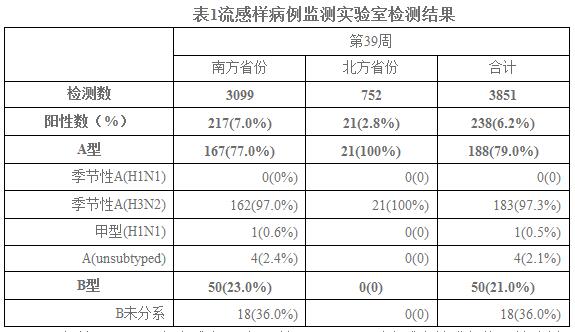 2014年第39周,全国流感监测网络实验室共检测流感样病例监测标本3851份,流感病毒阳性标本238份(6.2%),其中A型流感188份(79.0%)、B型流感50份(21.0%)。第39周,南方省份流感检测阳性率为7.0%,低于前一周(8.8%);北方省份流感检测阳性率为2.8%,低于前一周(3.6%)。南、北方省份检测到的流感各型别/亚型的数量和所占比例具体见表1。