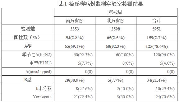 2014年第42周,全国流感监测网络实验室共检测流感样病例监测标本5951份,流感病毒阳性标本159份(2.7%),其中,A型流感125份(78.6%),B型流感34份(21.4%)。第42周,南方省份流感检测阳性率为2.8%,低于前一周(3.8%);北方省份流感检测阳性率为2.5%,低于前一周(3.3%)。南、北方省份检测到的流感各型别/亚型的数量和所占比例具体见表1。
