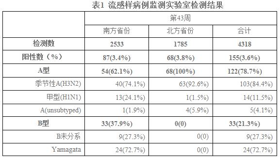 2014年第43周,全国流感监测网络实验室共检测流感样病例监测标本4318份,流感病毒阳性标本155份(3.6%),其中,A型流感122份(78.7%),B型流感33份(21.3%)。第43周,南方省份流感检测阳性率为3.4%,高于前一周(2.6%);北方省份流感检测阳性率为3.8%,低于前一周(2.7%)。南、北方省份检测到的流感各型别/亚型的数量和所占比例具体见表1。