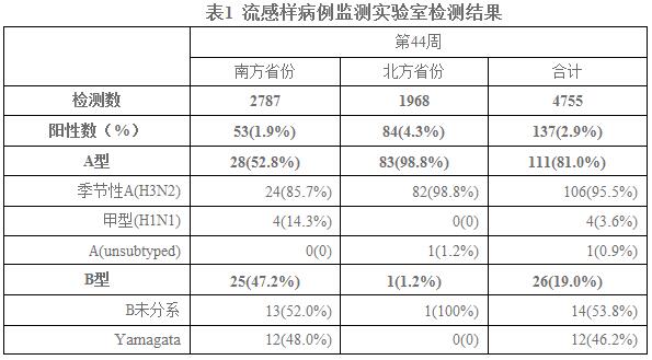 2014年第44周,全国流感监测网络实验室共检测流感样病例监测标本4755份,流感病毒阳性标本137份(2.9%),其中,A型流感111份(81.0%),B型流感26份(19.0%)。第44周,南方省份流感检测阳性率为1.9%,低于前一周(3.4%);北方省份流感检测阳性率为4.3%,高于前一周(3.8%)。南、北方省份检测到的流感各型别/亚型的数量和所占比例具体见表1。