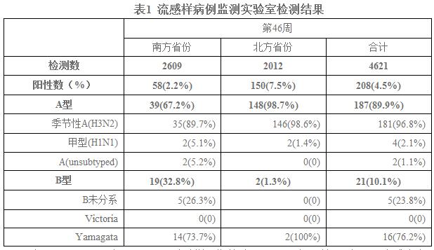 2014年第46周,全国流感监测网络实验室共检测流感样病例监测标本4621份,流感病毒阳性标本208份(4.5%),其中,A型流感187份(89.9%),B型流感21份(10.1%)。第46周,南方省份流感检测阳性率为2.2%,与前一周水平持平(2.2%);北方省份流感检测阳性率为7.5%,高于前一周(6.1%)。南、北方省份检测到的流感各型别/亚型的数量和所占比例具体见表1。