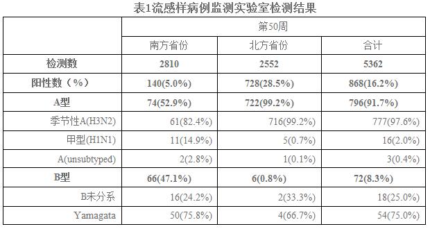 2014年第50周,全国流感监测网络实验室共检测流感样病例监测标本5362份,流感病毒阳性标本868份(16.2%),其中,A型流感796份(91.7%),B型流感72份(8.3%)。第50周,南方省份流感检测阳性率为5.0%,高于前一周(4.1%);北方省份流感检测阳性率为28.5%,高于前一周(24.5%)。南、北方省份检测到的流感各型别/亚型的数量和所占比例具体见表1。