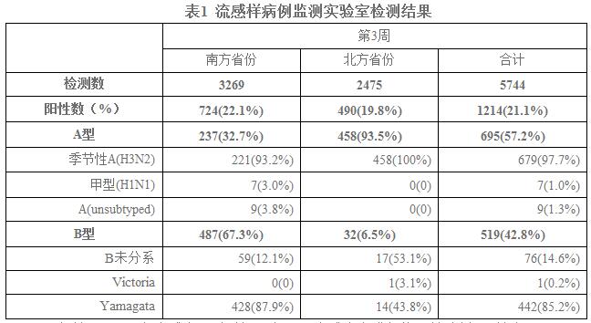 2015年第3周,全国流感监测网络实验室共检测流感样病例监测标本5744份,流感病毒阳性标本1214份(21.1%),其中,A型流感695份(57.2%),B型流感519份(42.8%)。第3周,南方省份流感检测阳性率为22.1%,高于前一周(19.3%);北方省份流感检测阳性率为19.8%,低于前一周(24.3%)。南、北方省份检测到的流感各型别/亚型的数量和所占比例具体见表1。