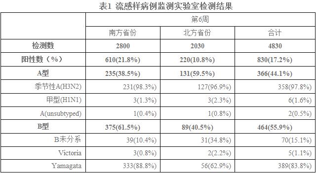 2015年第6周,全国流感监测网络实验室共检测流感样病例监测标本4830份,流感病毒阳性标本830份(17.2%),其中,A型流感366份(44.1%),B型流感464份(55.9%)。第6周,南方省份流感检测阳性率为21.8%,低于前一周(22.9%);北方省份流感检测阳性率为10.8%,低于前一周(11.4%)。南、北方省份检测到的流感各型别/亚型的数量和所占比例具体见表1。