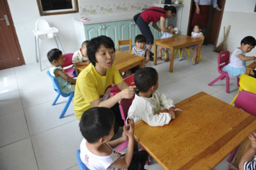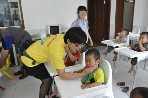 美好而快乐的时光总是过得很快,到了吃饭的时间了。显然孩子们还没有玩够,他们用柔弱的胳膊紧紧的搂着我们,不愿撒开,而我们能做的就是耐心的哄着他们去洗手吃饭。我们纷纷帮助天使妈妈把孩子们带到饭厅,帮他们洗手,然后让孩子们坐在小饭桌前等待开饭。洗手和等待的过程复杂而有序。由于年龄差距较大,大一点的孩子围坐在小饭桌面前,小一点的孩子要坐在专门的儿童座椅上。我们一起给孩子们喂饭,有的孩子一会儿就吃了两碗,有的则很挑食,我们也是想尽各种办法耐心的哄着、鼓励他们乖乖的吃饭。午饭过后,给孩子们将小脸和小手洗干净,送到休息室,我们踏上了归来的路程。大家都在静静地思考着…