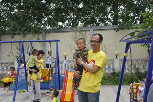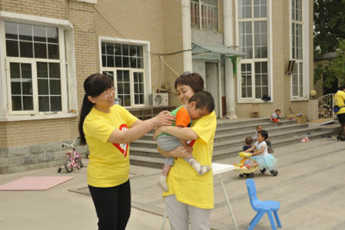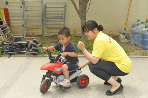 我们到达的时候,正是孩子们活动玩耍的时间。在得到管理员的同意后,我们进入了孩子们的活动区域。孩子们见到我们的第一反应不像正常家庭的儿童那样对我们感到陌生和害怕,而是张开他们瘦弱的双臂,眼睛里充满渴望的眼神,嘴里急切地喊出:“抱抱、抱抱”。这种渴望、这种急切让我们惊讶,更让我们无法拒绝,我们毫不犹豫地纷纷抱起面前的孩子,孩子们在我们怀里露出满足而温暖的眼神。由于我们人数有限,很多的孩子我们抱不过来,这时候看着他们期盼被怀抱的眼神,自己真恨不得多长几只胳膊。我们开始陪他们玩游戏,有的玩滑梯,有的做龙舟,有的骑玩具车,还有些行动不便的孩子只能坐在原地玩着玩具。我们的到来似乎也给他们增添了很多快乐!