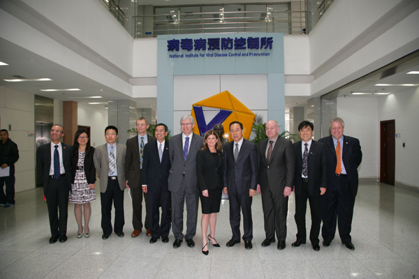 加拿大卫生部长那·安布罗斯(Rona Ambrose),. 加拿大驻华大使赵朴(Guy Saint-Jacques),部长办公室政策主任杰斯·韦泽(Jess Harrison Weiser), 副首席公共卫生官(副部级)格雷戈里·泰勒(Gregory Taylor),食品局局长塞缪尔·戈德弗洛伊(Samuel Godefroy)和国际事务办公室高级顾问彭文妍(Winnie Pang)一行6人参观病毒病所国家流感中心。