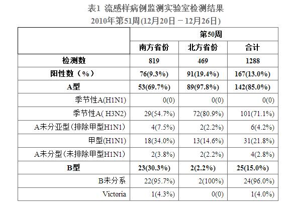 2010年第51周,全国流感监测网络实验室共检测1288份标本,其中流感病毒阳性标本167份(13.0%)。流感病毒阳性标本中,A型142份(85.0%),B型25份(15.0%)。A型流感病毒阳性标本中,A(H3N2)流感101份(71.1%),甲型(H1N1)流感31份(21.8%),A未分亚型(排除甲型H1N1)6份(4.2%)。25份B型流感中,1份为B(Victoria),24份未分系。(表1)