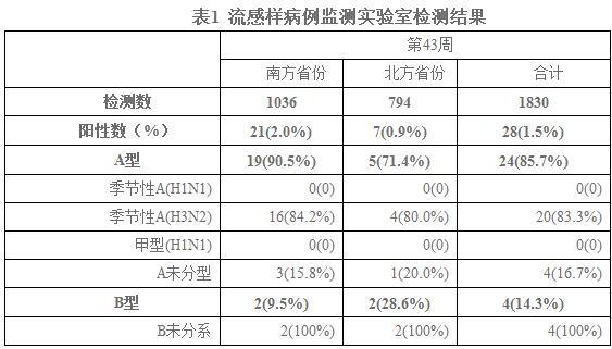 2012年第43周,全国流感监测网络实验室共检测1830份标本,其中流感病毒阳性标本28份(1.5%),以A型流感病毒为主(85.7%)。第43周,南方省份流感检测阳性率为2.0%,高于前一周(1.9%);北方省份流感检测阳性率为0.9%,低于前一周(1.8%)。南、北方省份检测到的流感各型别/亚型的数量和所占比例具体见表1。
