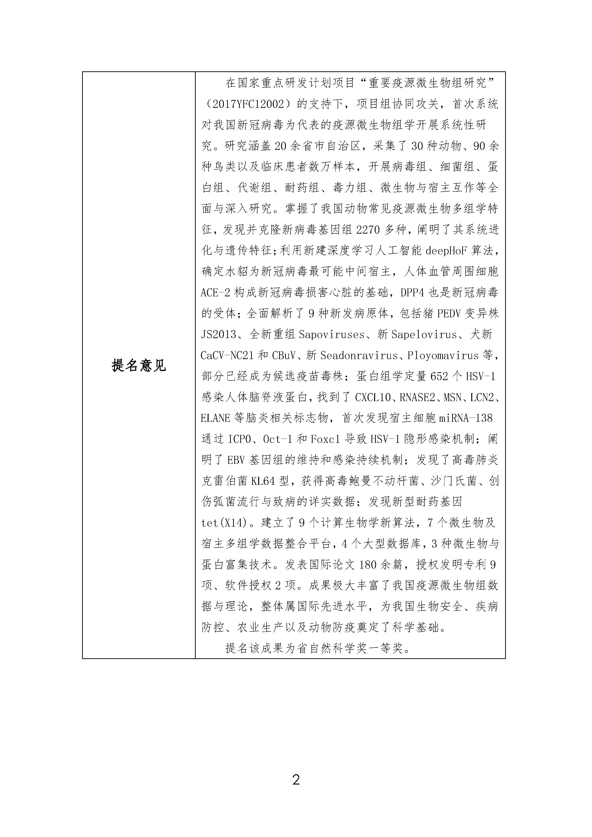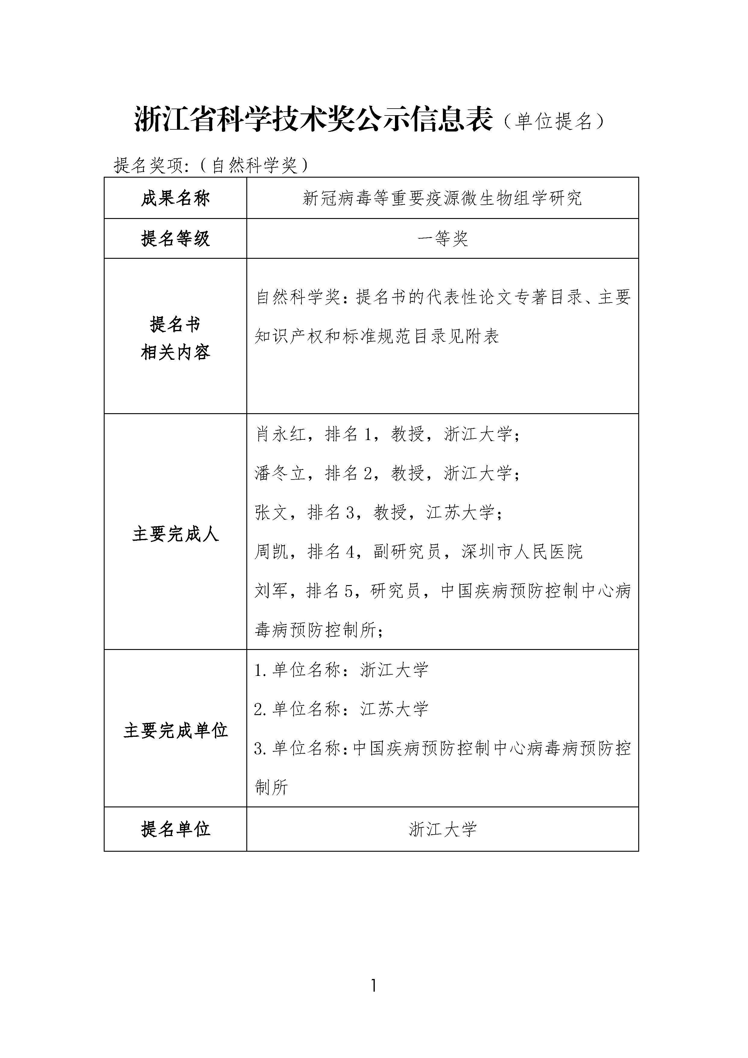 根据《浙江省科学技术厅关于开展2021年度浙江省科学技术奖提名工作的通知》要求,我单位参与《新冠病毒等重要疫源微生物组学研究》项目申报2021年度浙江省科学技术奖,相关成果在本单位进行公示,公示内容详见附件。公示期:2022年3月2日至 2022年3月8日。