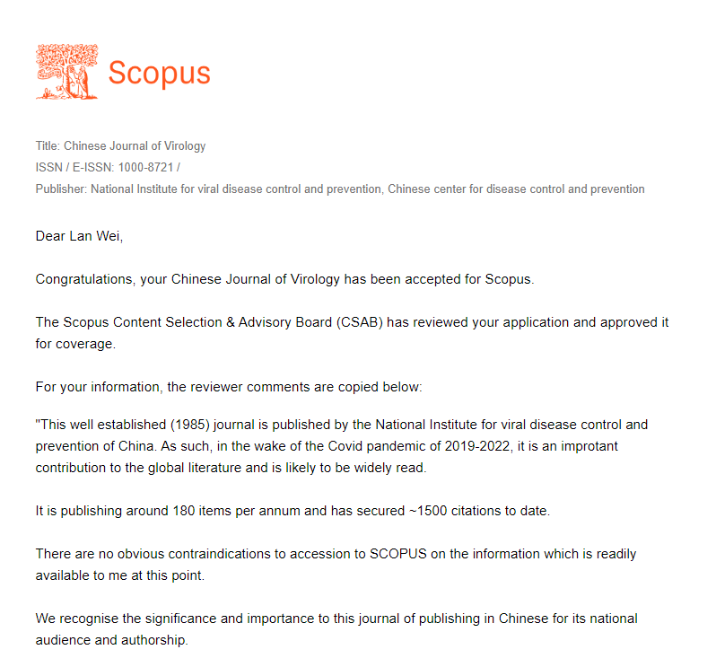 2026年1月8日,Elsevier旗下Scopus数据库评审部正式致函《病毒学报》编辑部:经 Scopus Content Selection & Advisory Board(CSAB)评审,《病毒学报》(Chinese Journal of Virology)被Scopus数据库批准收录。